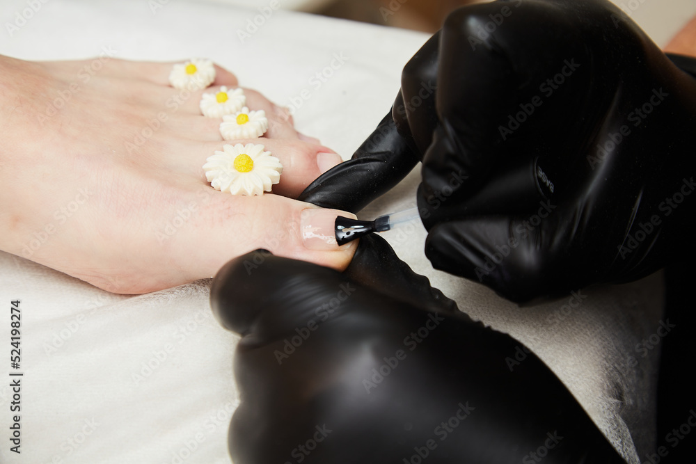 The manicure and pedicure master covers the nail with a pedicure salon. On the hands of the pedicure master are black gloves. Foot care procedure, decorative design on the feet.