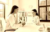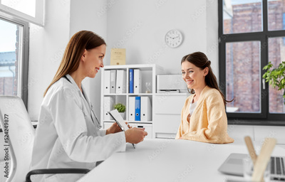 medicine, healthcare and people concept - smiling female doctor or cardiologist with clipboard showing cardiogram to woman patient at hospital