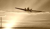 Vintage type old metallic propeller airplane in the sky, sunset clouds with calm sea in the background