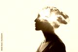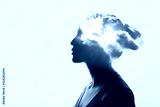 Atmosphere pressure and woman mental health contemplation concept. Multiple exposure clouds and sun on female head silhouette.