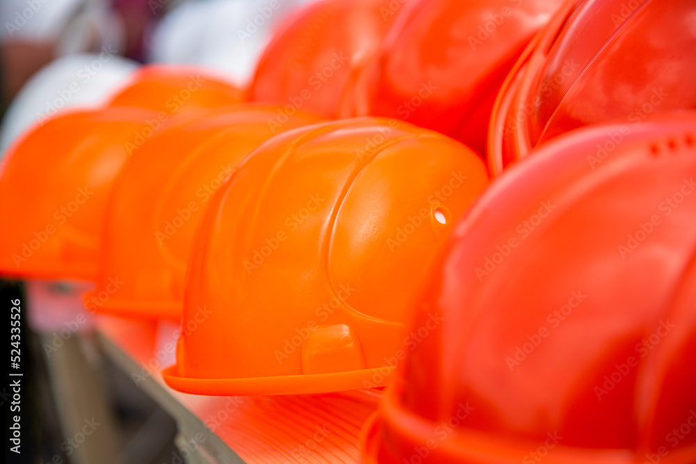 onstruction helmets. Yellow safety helmets. Orange safety helmets construction. Set orange deferential helmet, construction tools for industrial safety. Set of protective hardhats