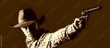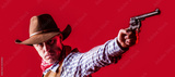 American bandit in mask, western man with hat. West, guns. Portrait of a cowboy. owboy with weapon on red background