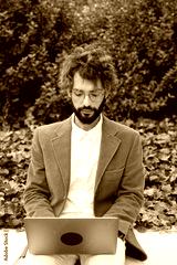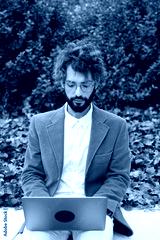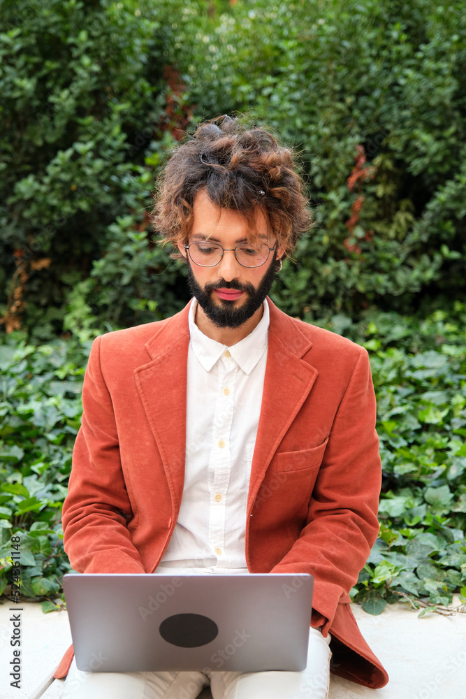 Stylish businessman with glasses working with laptop while sitting outdoors.