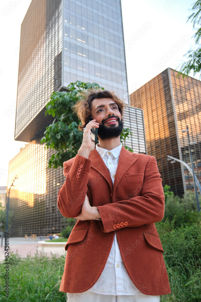 Businessman with makeup looking away and smiling while talking on the phone in the financial district.
