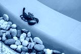 Scary black scorpion crawling on swimming pool. During hot spring and summer days, they often wander into homes in search of water.
