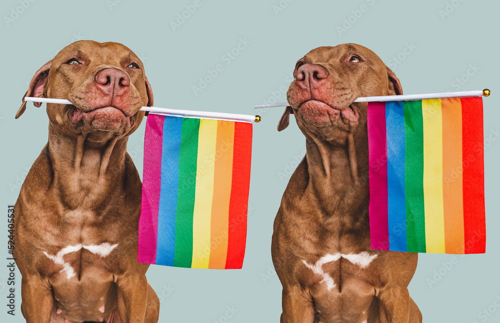 Lovable, pretty dog and Rainbow Flag. Close-up, indoors. Studio photo. Congratulations for family, loved ones, relatives, friends and colleagues. Pets care concept