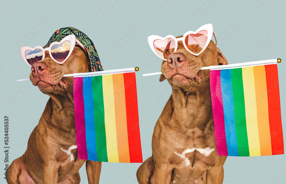 Lovable, pretty dog and Rainbow Flag. Close-up, indoors. Studio photo. Congratulations for family, loved ones, relatives, friends and colleagues. Pet care concept