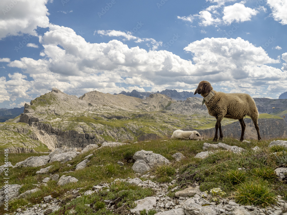 baby newborn sheep portrait relaxing on dolomites mountains background