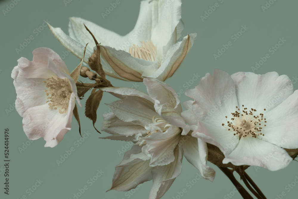 Delicate white flowers on a blue-green background, pastel colors, studio shot.