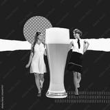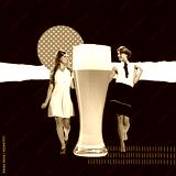 Contemporary art collage. Beautiful young women in retro style dresses walkign near big ager beer isolated on black background