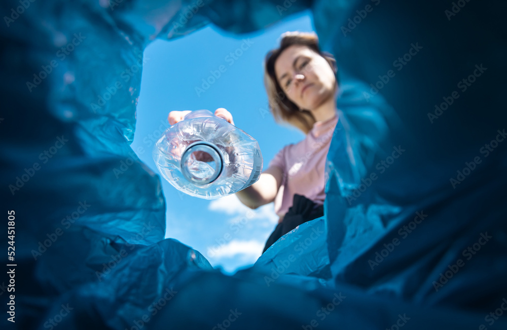 A woman throws a plastic bottle into the trash. Close-up from inside the trash can