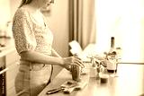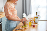 drinks and people concept - close up of woman with shaker making cocktail at home kitchen