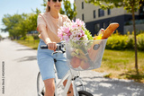 people, leisure and lifestyle - close up of happy woman with food and flowers in basket of bicycle on city street