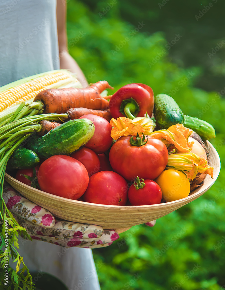 Farmer woman harvests vegetables in the garden. Selective focus.
