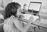 Homeschooling by a smart and clever little girl attending online or virtual class using a laptop and headphones. A young child writing and working or doing homework at home listening to music