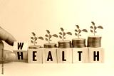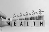 Hand holding wood cube block wealth and health with coin and tree on table.Business finance saving money wealth insurance and health care concept.