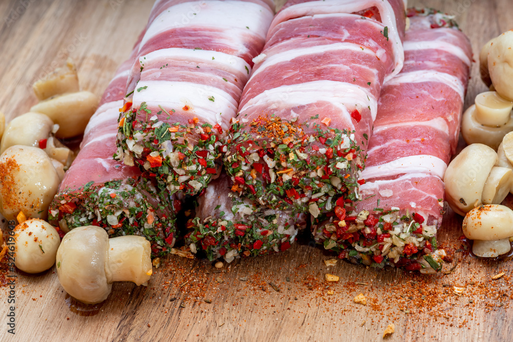 Bacon-wrapped meat roll with spices and herbs. Jamon pork, prosciutto, or presunto meat products, tartare meat inside. Meatloaf close up high focus view with shallow depth of field on a wooden board