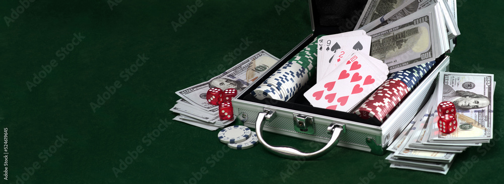 Gambling Briefcase Full of Money Cash, jackpot, casino chips. Suitcase with dollars, poker chips. Metal cash box Container stuffed with Paper currency, Casino tokens, gaming chips, checks, or cheques