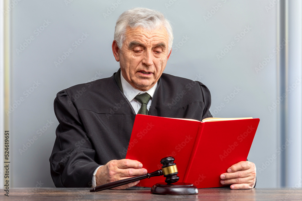 Judge reading the verdict. Judge's gavel on the table in the courtroom. Law Lord wearing gown using a hammer for attention, justice judgment at courts of law