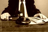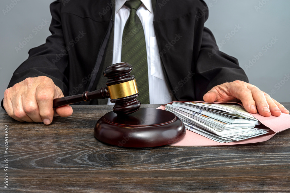 Judge and money concept. Judge's gavel on the table. Law Lord wearing gown using a hammer for verdict, justice judgment at courts of law. Dollars, bill, corruption, cost, finances, expenses, salary