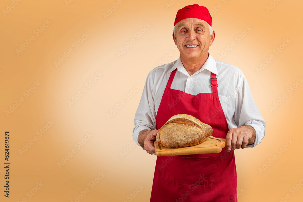 Chef-cooker in chef's hat and apron working in bakery, holding French bread board with bread. Senior professional baker man wearing chef's outfit. Character kitchener, pastry chef for advertising