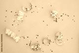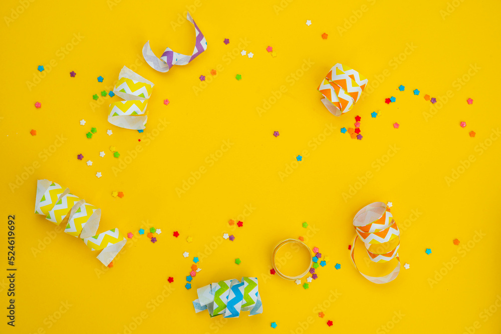 Abstract colored party background. Multi-colored serpentine ribbon scattered on bright paper. Base for design nice scene, wallpaper, poster