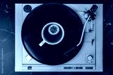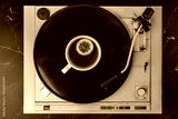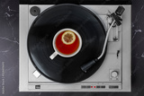 Turntable Vinyl records, party music, top view. Cup of tea. Vintage retro sound recording style. Background for the design of a poster, postcard, flyer for music events
