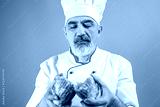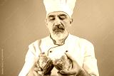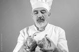 Professional baker offering freshly baked bread. Chef-cooker in a chef's hat and jacket. Senior baker man wearing a chef's outfit. Character kitchener, pastry chef for advertising
