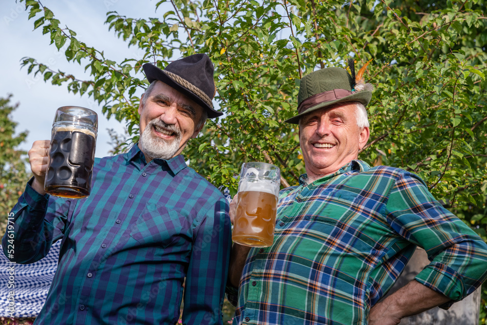 Senior men with beer mugs with Bavarian beer in Tyrolean hats celebrating a beer festival in Germany. Happy old people during the October holiday in Munich