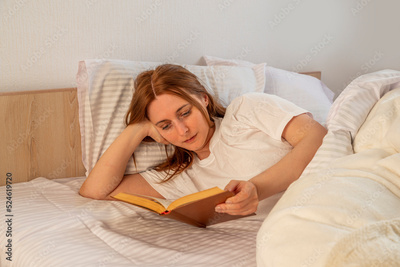 Woman sreading book in bed at home. Deep sleep. Lady with long brown hair wearing a nightgown. High Angle View girl lying in a nightie on clean white bed linen with cozy blanket