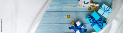 Dreidel, dreidle or dreidl with blue lettering on wooden background. Gift box, spinning top, Jewish holiday of Hanukkah, Jewish teetotum, gold coin