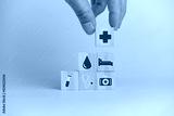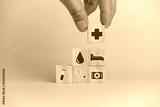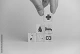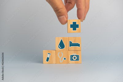 Hand holding wooden cubes block with insurance health car medical symbol on background and copy space.