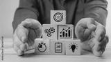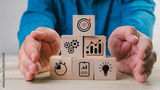 Business goal achievement concept of business strategy and action plan. businessman hand wooden cube block stacking with icon