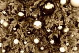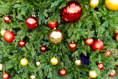 Abstract view of a large, outdoor Christmas Tree showing the large baubles and reflections from the outside.