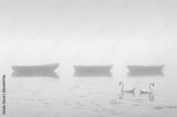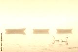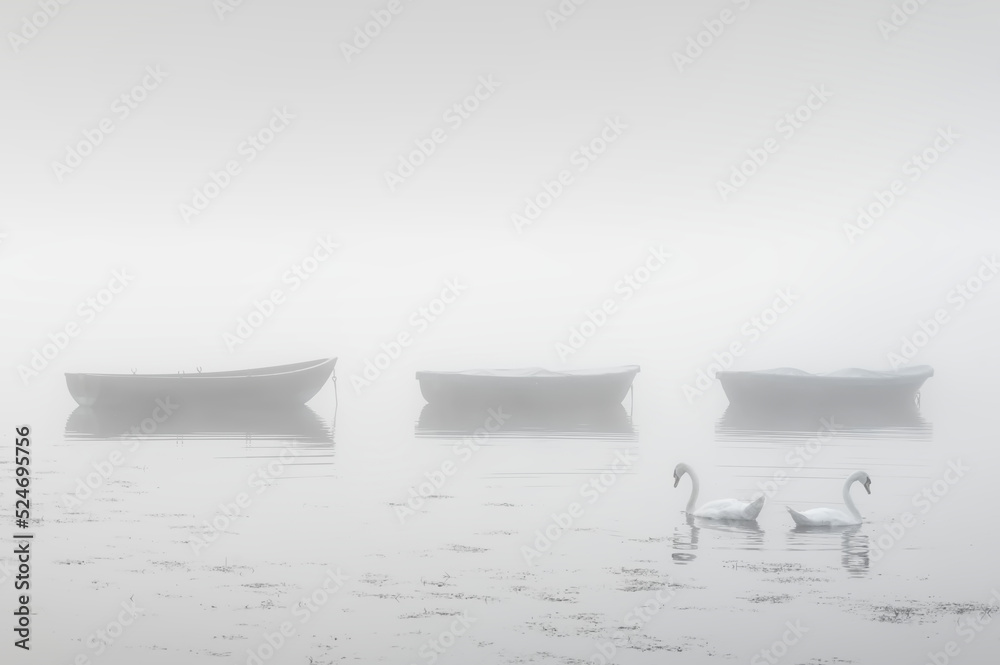 Swans paddling in lake and early morning mist with boats in background