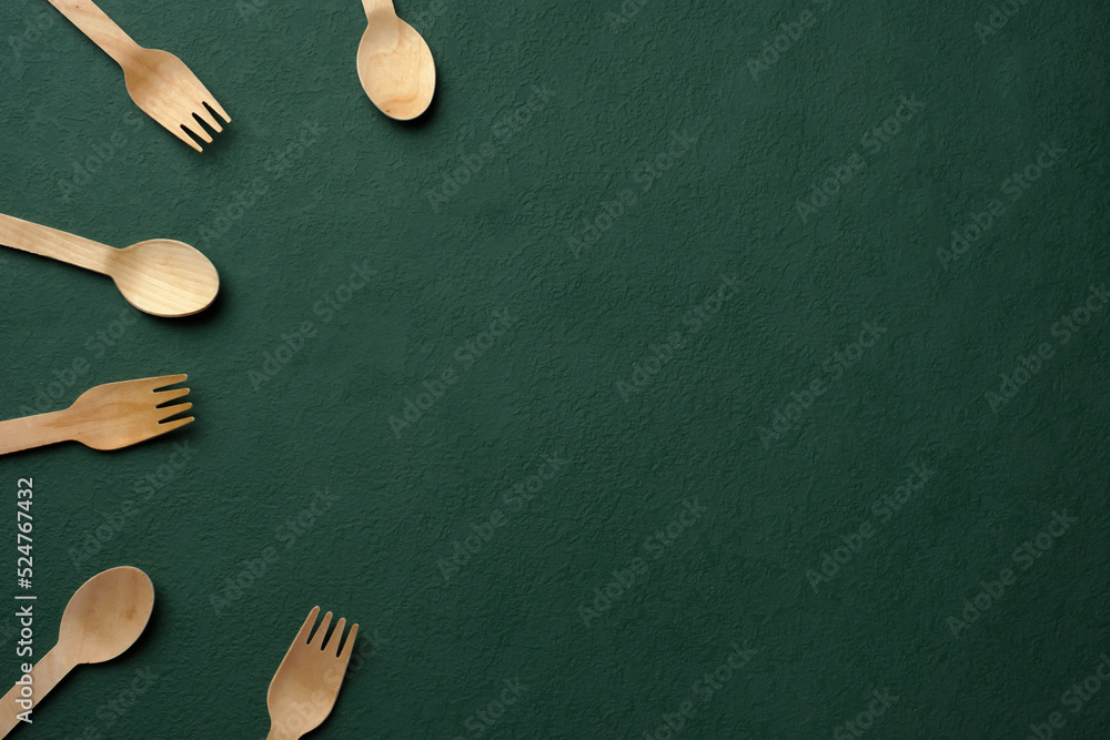 Plastic free set bamboo spoon and fork on dark green background.Zero waste disposable kitchen ware