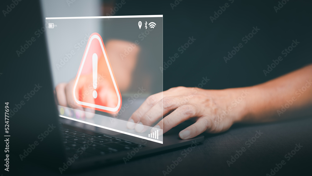 Businessman working on laptop computer, exclamation mark, alarm, warning, computer virus detected, danger warning concept or information error that should be urgently fixed and repaired.