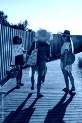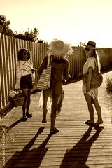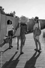 Happy female friends going to beach. Laughing women in summer clothes walking together, holding basket. Friendship, leisure, summer concept