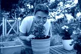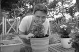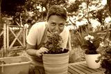 Happy woman growing potted plants. Female gardener in apron and gloves smelling flower in pot. Gardening, hobby concept