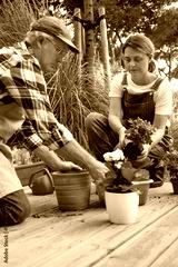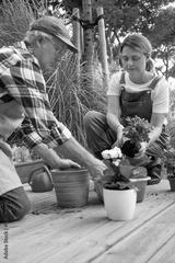 Woman and man growing plants in pots. Female and male gardeners working together. Gardening, hobby concept