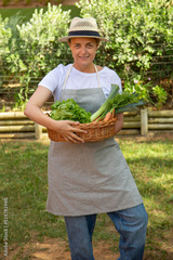 Happy woman holding salad and vegetable harvest. Female gardener in apron and hat holding basket with food. Gardening, hobby concept