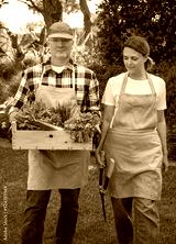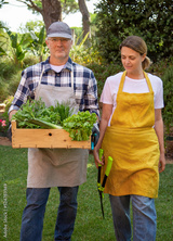 Pleased man and woman holding salad and vegetable harvest. Gardeners in aprons holding crate with food. Gardening, hobby concept