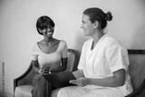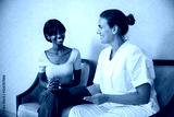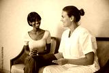 Smiling young African American woman visiting doctor in clinic. Happy female doctor or nurse wearing lab coat, holding clipboard and talking to female patient. Visiting doctor concept