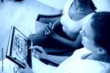 Female dentist showing x-ray of jaws to African American woman. Young female patient wearing T-shirt and jeans having consultation in stomatology clinic. Dental care concept