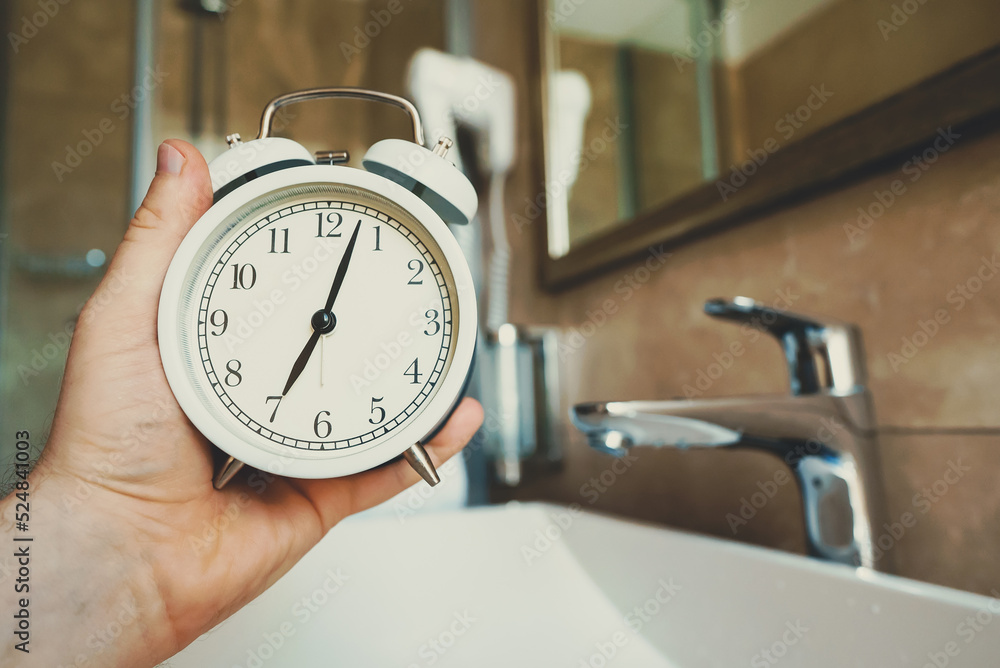 The clock shows 7 am. Time to wash up and brush your teeth.