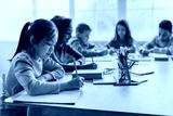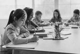Asian Schoolgirl Taking Notes Learning Sitting In Modern Classroom