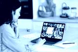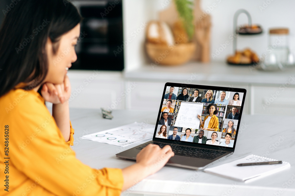 Remote lesson. Positive smart Asian female student, sitting at the table, listening to an online lecture, on the screen of a laptop, a teacher telling information, and a group of multiracial people