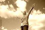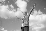 Smiling senior woman outdoors with outstretched arms in the blue sky while a plane passes in the sky.