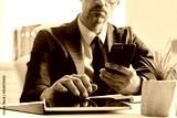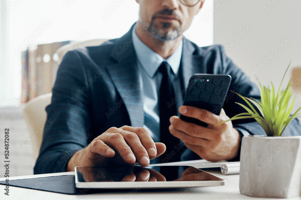 Close-up of unrecognizable mature man in formalwear using digital tablet while sitting in the office