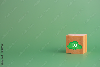 Net zero and carbon credit with wood cube block icon co2 eco on green background.